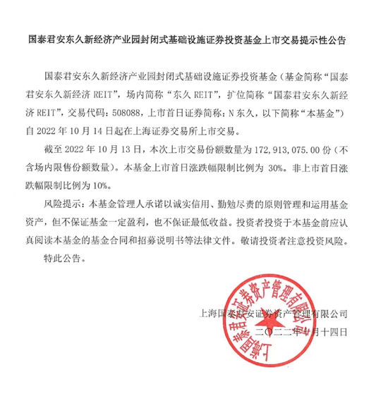 据悉,招商证券东久新经济工业园封闭式基础设施证券投资公募基金,是国内首个民营工业园区REITs东久新经济REIT询价阶段,网下询价倍数也达到了100.94倍的较高水平,认购价格为3.035元/份,按5亿份的发售份额计算,募集资金总额超过15.175亿元。