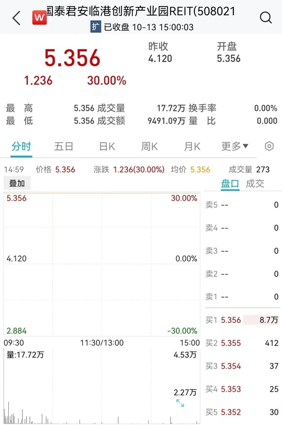10月13日,公募公募基金REITs挂牌上市商品再迎提速,招商证券长兴岛技术创新工业园REIT正式挂牌上市,开售康孔县30%跌停,直到尾盘仍未关上跌停板,收市报5.356元,全日成交量数额达9491.09万元,占当天公募公募基金REITs消费市场全部成交量数额28.48%。