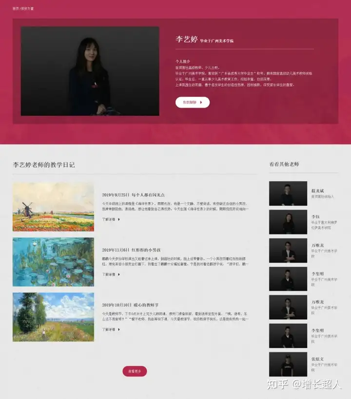 于是我们突破了常规的教师介绍,优先选择让每一位老师都把他教学的过程写成了教学日记,并关联到了个人介绍的页面访客在阅读教学日记的过程中自然会对这位老师产生亲近感,并留下更立体的印象。