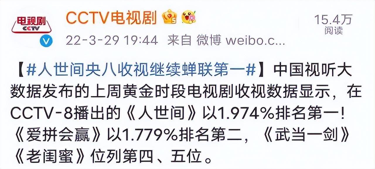 这种关注度,是前所未有的,也从侧面证明,《高歌猛进》确实是第三部国民xHO第三种,充分体现在美誉度上《世间》播毕以后,不仅拿到了超过8的新浪网评分,还获得了基本上全年龄层观众们的完全一致好评后来《世间》在央八播映,收视再次问鼎第三,Axat当时的网剧《心居》,所有的新片都不是对手。