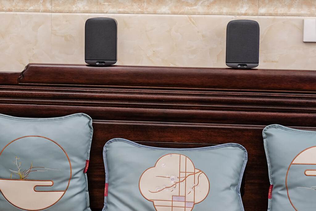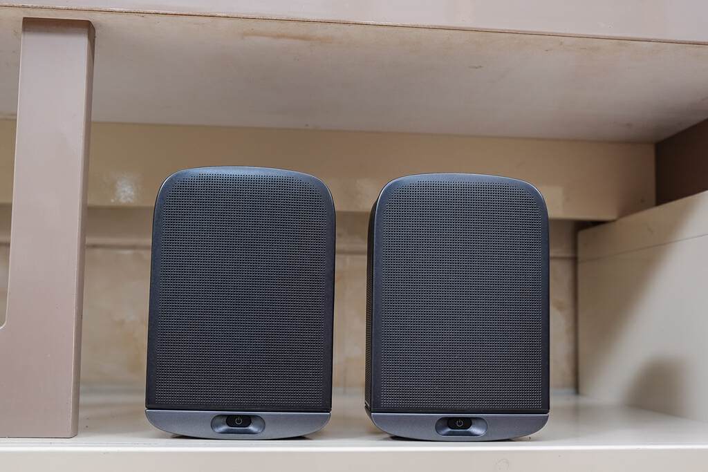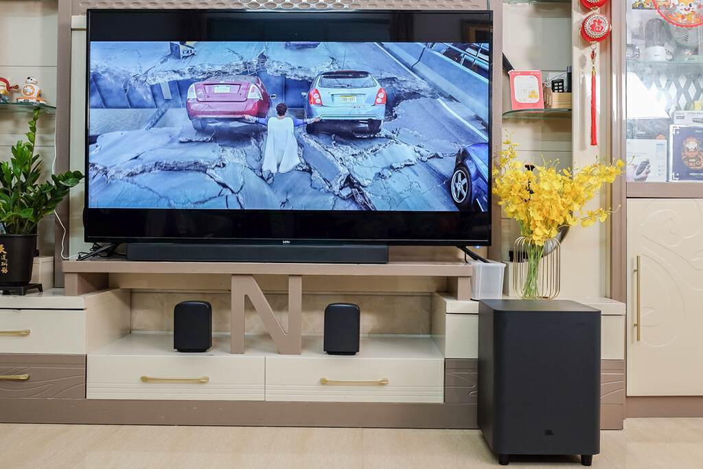 正因为三个有线音箱的自由性,可以根据自己需求来进行摆放,可以跟条形耳机放一起,也可以放在我们坐的地方的左右两侧,这样能起到包围的效用,声音更加的沉浸。